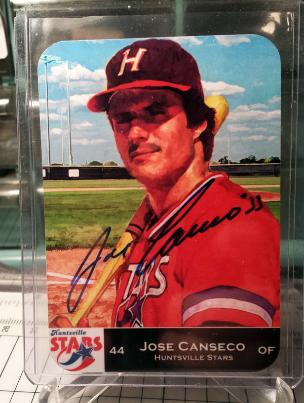 Here is a summary – In 1985, the grocery store, “Mouschi’s” had members of the Huntsville Stars sign for them. Jose got called up, and could not fulfill the autograph promises of the store, so all the cards were destroyed … except for one. This one: